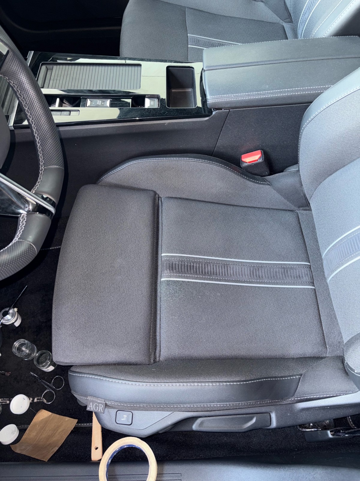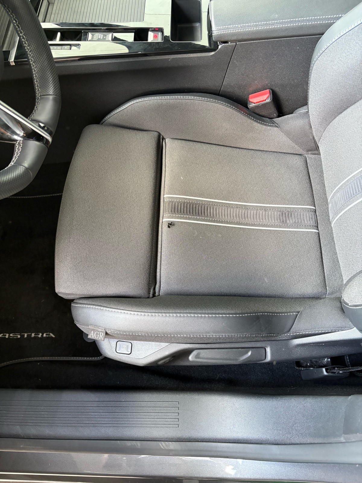 Rénovation d’un siège en tissus après un trou de cigarette sur sellerie Opel Astra effectuée à Bordeaux à domicile